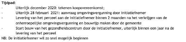 Op 16 oktober 2019 is het raadsbesluit ‘meewerken aan realisatie gezondheidsplein Den Burg Zuid’ unaniem aangenomen. Dat Gezondheidsplein is er nog steeds niet, terwijl wij toen voorgestemd hebben, met de gedachte dat het snel gerealiseerd zou worden. In het antwoord op een vraag van CDA Texel over het gezondheidsplein op 5 oktober 2020 wordt zelfs het volgende tijdpad voor het Gezondheidsplein aangegeven: