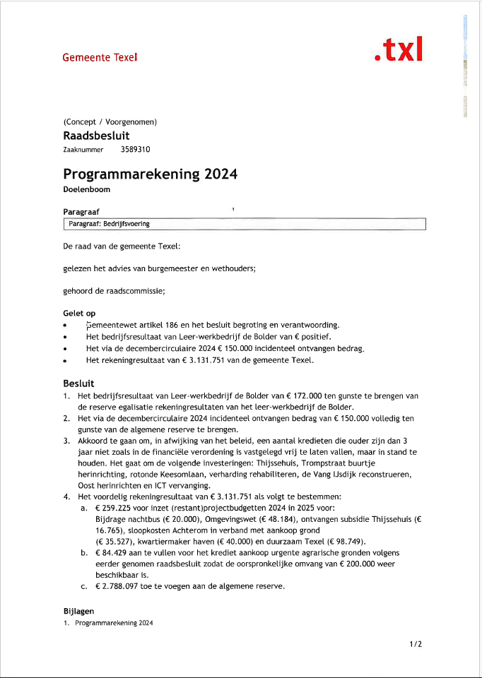 Rekeningsaldo op hoofdlijnen gemeente Texel